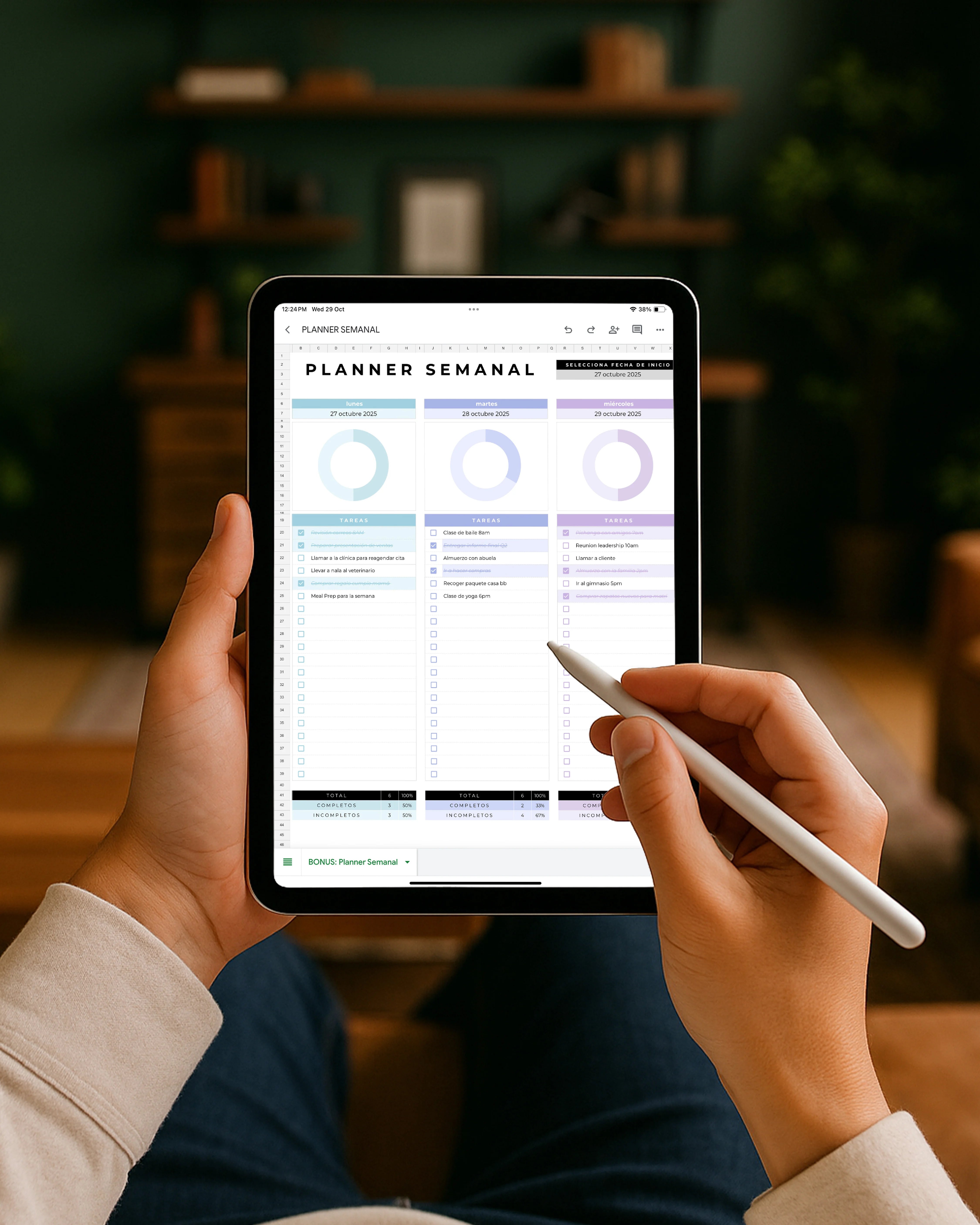 Cada día cuenta con su propio tablero, checklist y un gráfico automático que muestra tu porcentaje de avance. Así puedes ver de inmediato cuánto has completado, qué te falta y cómo va tu semana.