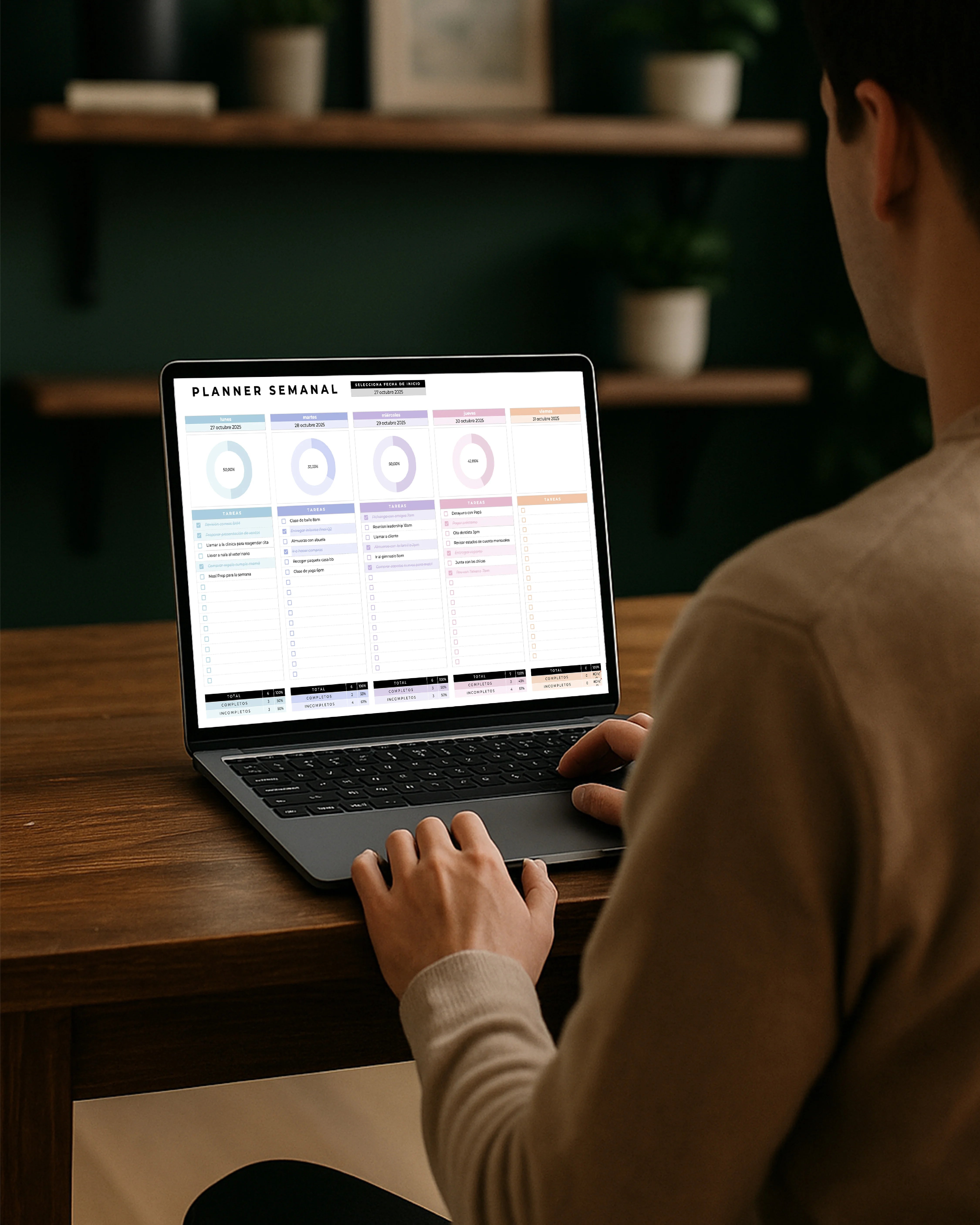 Organiza tus tareas con un sistema visual que te muestra tu progreso real. Cada checklist y gráfico automático te ayuda a mantener el foco, cumplir tus pendientes y cerrar la semana con la sensación de avance y calma.